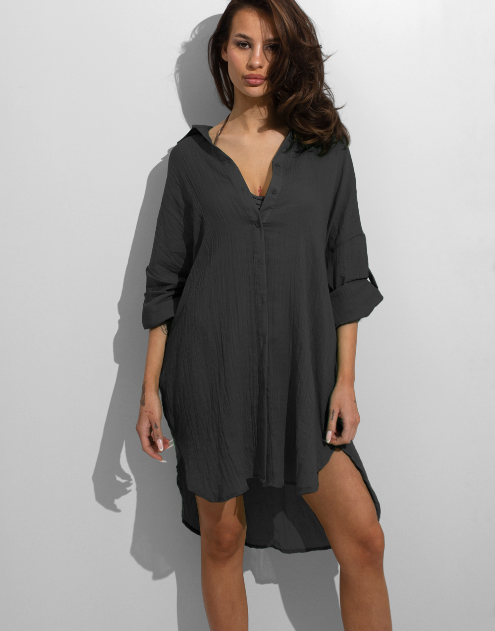 Плажна риза от бързосъхнеща памучна материя. Свободен силует с копчета по цялата дължина. Добър избор за екстравагантна плажна визия и летни разходки. Състав:75% памук, 5% коприна, 20% лен.